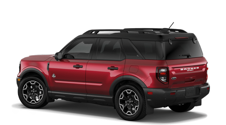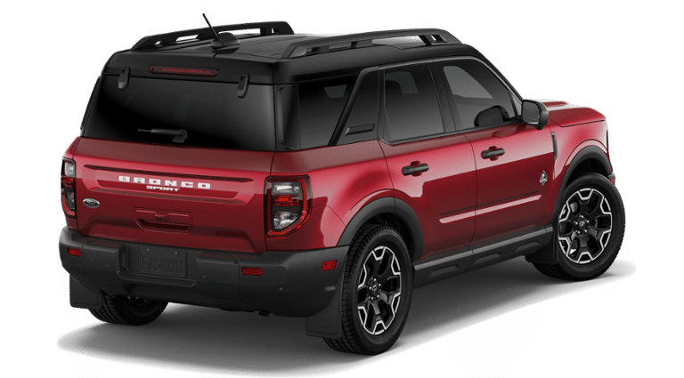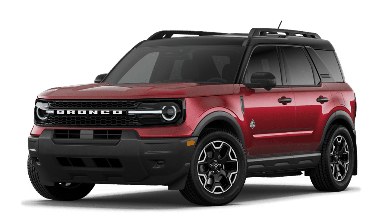 Ruby Red 2026 Ford Bronco Sport Outer Banks 4WD 8-Speed Automatic 1.5L EcoBoost 4-Wheel Disc Brakes, 6 Speakers, ABS brakes, Air Conditioning, Alloy wheels, AM/FM radio: SiriusXM with 360L, AM/FM Stereo, Apple CarPlay/Android Auto, Auto High-beam Headlights, Auto-dimming Rear-View mirror, Automatic temperature control, Brake assist, Compass, Delay-off headlights, Driver door bin, Driver vanity mirror, Dual front impact airbags, Dual front side impact airbags, Electronic Stability Control, Emergency communication system: SYNC 4 911 Assist, Exterior Parking Camera Rear, Ford Connectivity Package (1-Year Included), Four wheel independent suspension, Front anti-roll bar, Front Bucket Seats, Front Center Armrest, Front Driver/Passenger Seat Back Map Pockets, Front dual zone A/C, Front fog lights, Front reading lights, Fully automatic headlights, Heated door mirrors, Heated front seats, Heated steering wheel, Illuminated entry, Internet access capable: 5G Modem - Ford Connectivity Package, Knee airbag, Low tire pressure warning, Memory seat, Occupant sensing airbag, Outside temperature display, Overhead airbag, Overhead console, Panic alarm, Passenger door bin, Passenger vanity mirror, Power door mirrors, Power driver seat, Power passenger seat, Power steering, Power windows, Radio data system, Rear anti-roll bar, Rear Parking Sensors, Rear reading lights, Rear seat center armrest, Rear window defroster, Rear window wiper, Remote keyless entry, Security system, SiriusXM with 360L, Speed control, Speed-sensing steering, Speed-Sensitive Wipers, Split folding rear seat, Steering wheel mounted audio controls, SYNC 4 with Enhanced Voice Recognition, Tachometer, Telescoping steering wheel, Tilt steering wheel, Traction control, Trip computer, Variably intermittent wipers, Wheels: 18" Ebony Black.