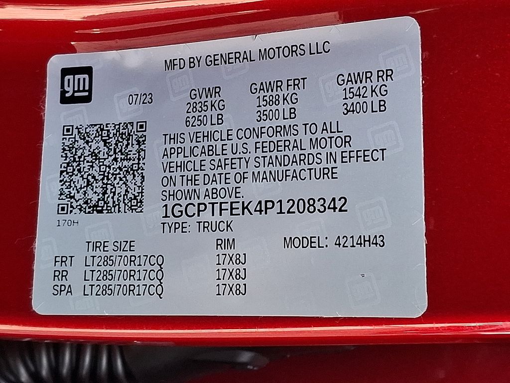 4WD, 1st & 2nd Row All-Weather Floor Liner (LPO), 3.42 Rear Axle Ratio, 4-Way Manual Passenger Seat Adjuster, 4-Wheel Disc Brakes, 6 Speakers, 6-Speaker Audio System Feature, 8-Way Power Driver Seat Adjuster, ABS brakes, Adaptive Cruise Control, Air Conditioning, Alloy wheels, AM/FM radio: SiriusXM, Apple CarPlay/Android Auto, Auto High-beam Headlights, Auto-dimming Rear-View mirror, Automatic Emergency Braking, Automatic temperature control, Blind Zone Steering Assist, Bose Premium 7-Speaker Audio System Feature, Brake assist, Chevy Safety Assist, Cloth/Evotex Seat Trim, Compass, Delay-off headlights, Driver & Front Passenger Ventilated Seats, Driver door bin, Driver Memory Settings, Driver Seatback Map Pocket, Driver vanity mirror, Dual front impact airbags, Dual front side impact airbags, Electronic Automatic Cruise Control, Electronic Stability Control, Following Distance Indicator, Forward Collision Alert, Front anti-roll bar, Front Bucket Seats, Front Center Armrest, Front dual zone A/C, Front fog lights, Front License Plate Kit, Front Pedestrian & Bicyclist Braking, Front reading lights, Front wheel independent suspension, HD Surround Vision, Heated door mirrors, Heated Driver & Front Passenger Seats, Heated front seats, Heated Steering Wheel, Illuminated entry, IntelliBeam Automatic High Beam On/Off, Lane Keep Assist w/Lane Departure Warning, Low tire pressure warning, Navigation System, Occupant sensing airbag, Outside temperature display, Overhead airbag, Overhead console, Panic alarm, Passenger door bin, Passenger Seatback Map Pocket, Passenger vanity mirror, Perforated Leather-Appointed Seat Trim, Power door mirrors, Power Driver Lumbar Control Seat Adjuster, Power driver seat, Power Sliding Glass w/Manual Shade Sunroof, Power steering, Power windows, Preferred Equipment Group 4ZR, Radio data system, Radio: 11.3" Diagonal Advanced Color LCD Display, Rear Center Armrest, Rear Cross Traffic Braking, Rear Park Assist, Rear Pedestrian Alert, Rear reading lights, Rear step bumper, Rear window defroster, Rear-Window Electric Defogger, Remote keyless entry, Removable Front Off-Road Assist Steps (LPO), Safety Package, Security system, SiriusXM Radio, Speed control, Speed-sensing steering, Split folding rear seat, Steering Wheel Mounted Audio Controls, Steering wheel mounted audio controls, Tachometer, Technology Package, Telescoping steering wheel, Tilt steering wheel, Traction control, Trip computer, Underbody Cameras, Variably intermittent wipers, Wheels: 17" x 8" Graphite & Oxide Gold Aluminum, Wireless Charging, Wireless Phone Projection, ZR2 Convenience Package III, ZR2 Off-Road Package, 4WD.